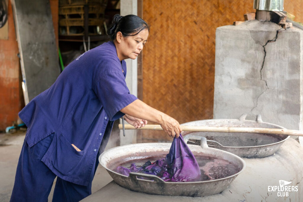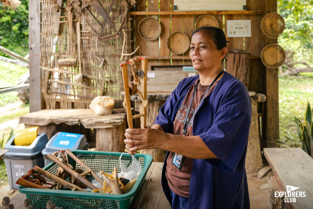 พอช่วงสาย ๆ หลังพักเหนื่อยกันเรียบร้อย พี่นักสื่อความหมายท้องถิ่นชวนเรานั่งรถอีแต๊ก ไปชมชุมชน ตั้งแต่จุดชมวิวสะพานไม้รวมใจที่ถ่ายรูปสวยมาก ชมกระบวนการทำผ้าหมักโคลนภูมิปัญญาดั้งเดิมของชุมชน แวะไปเล่นตุ๊กตาบาร์โหน ที่ความจริงนั้นไม่ได้เป็นแค่ของเล่น แต่ยังคิดค้นมาไว้เป็นอุปกรณ์บริหารมือที่พกพาไปได้ทุกที่อีกด้วย