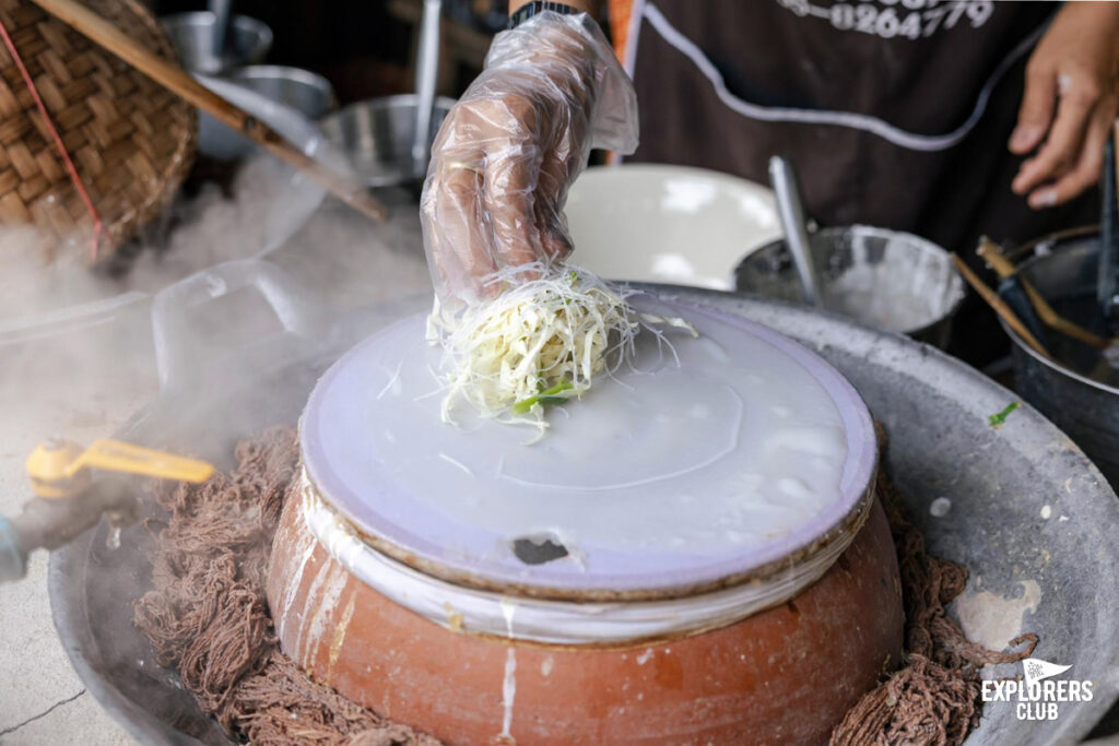 อีกอย่างหนึ่งคืออาหารรสชาติดีอย่าง ข้าวเปิ๊บ เมนูทานง่ายที่ชาวบ้านสืบทอดกันมานานตั้งแต่ช่วงที่ในชุมชนยังหาซื้อเส้นก๋วยเตี๋ยวได้ยาก ชาวบ้านจึงประยุกต์เอาข้าวสารข้าวจ้าวมาผ่านกระบวนการทำแป้งหมัก นึ่งเป็นแผ่น และทับซ้อนกันไปมาคล้ายข้าวเกรียบปากหม้อ (คำว่า เปิ๊บ มาจากคำว่า พับ ทบ ในภาษาถิ่น) ใช้แทนเส้นก๋วยเตี๋ยว ปรุงน้ำซุป เติมผักตำลึง เนื้อหมู และไข่ดาว