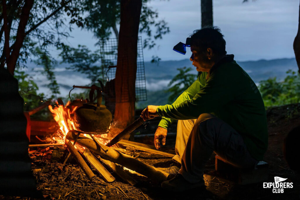 ในทริปนั้นหลังเสร็จงานแถว ๆ ชุมชนท่าชัย-ศรีสัชนาลัย พวกเรามุ่งหน้าไปค้างคืนที่โฮมสเตย์บ้านนาต้นจั่น พี่เจ้าของบ้านต้อนรับเราด้วยอาหารขันโตกชุดใหญ่เป็นมื้อเย็น วันรุ่งขึ้นได้เดินเทรลสั้น ๆ ไปดูพระอาทิตย์ขึ้นที่ ‘จุดชมวิวห้วยต้นไฮ’ เส้นทางนี้ยาวประมาณหนึ่งกิโลเมตร ที่มือใหม่ก็เดินได้สบาย ขอให้ร่างกายพร้อม แต่ไม่เหมาะกับรองเท้าแตะนะครับ อาจจะบาดเจ็บได้ เพราะบางจุดมีความชัน และเส้นทางไม่เรียบเท่าไรนัก