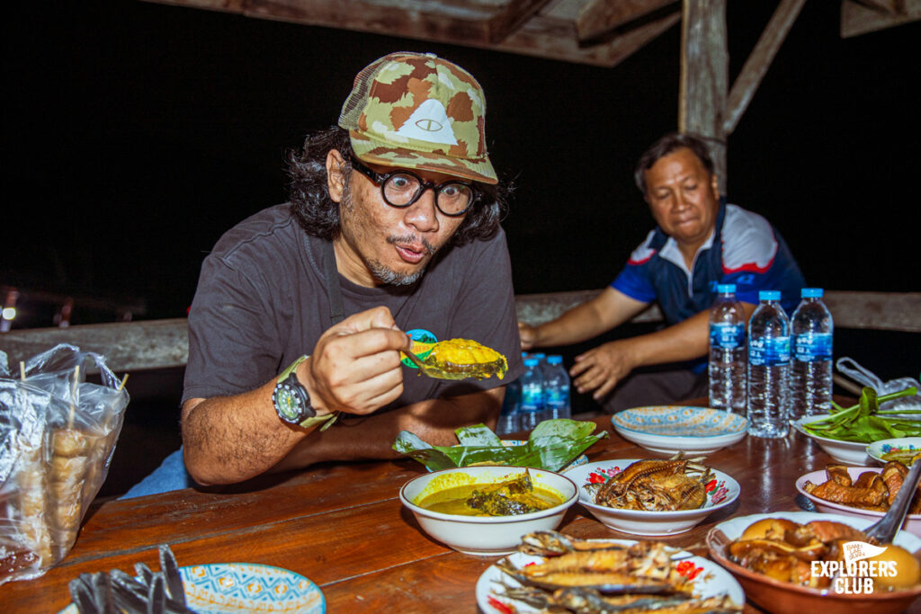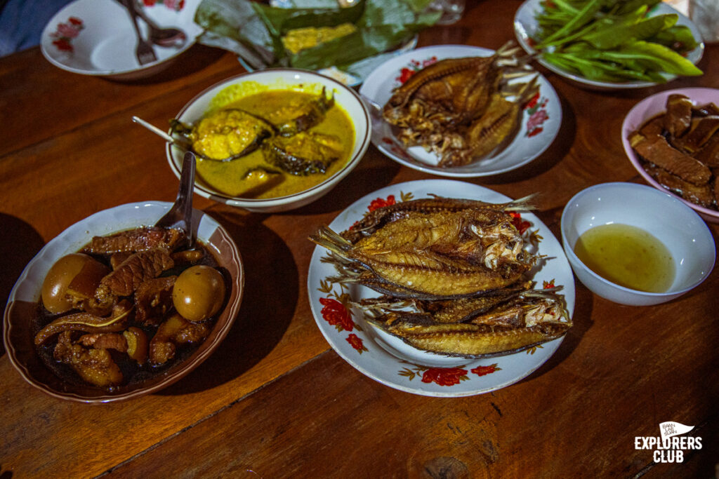 พวกเราเบิ้ลข้าวเพลินกันสองสามจานจนลืมชวนเจ้าของบ้านกินด้วย มื้อเย็นที่พวกผมกำลังโซ้ยกันหนุ่บหนั่บนี้ก็ไม่ใช่ว่ามาจากร้านอาหารที่ไหน แต่มาจากพี่ ๆ ชาวบ้านเขานี่แหละกินกันบนบ้านเขา กับข้าวเขาก็ใจดีทำเผื่อมาให้แขกอย่างพวกเรากิน นี่แหละครับความดีงามของการมีคนพาเที่ยวเป็นคนพื้นที่อยู่ดีกินอร่อย