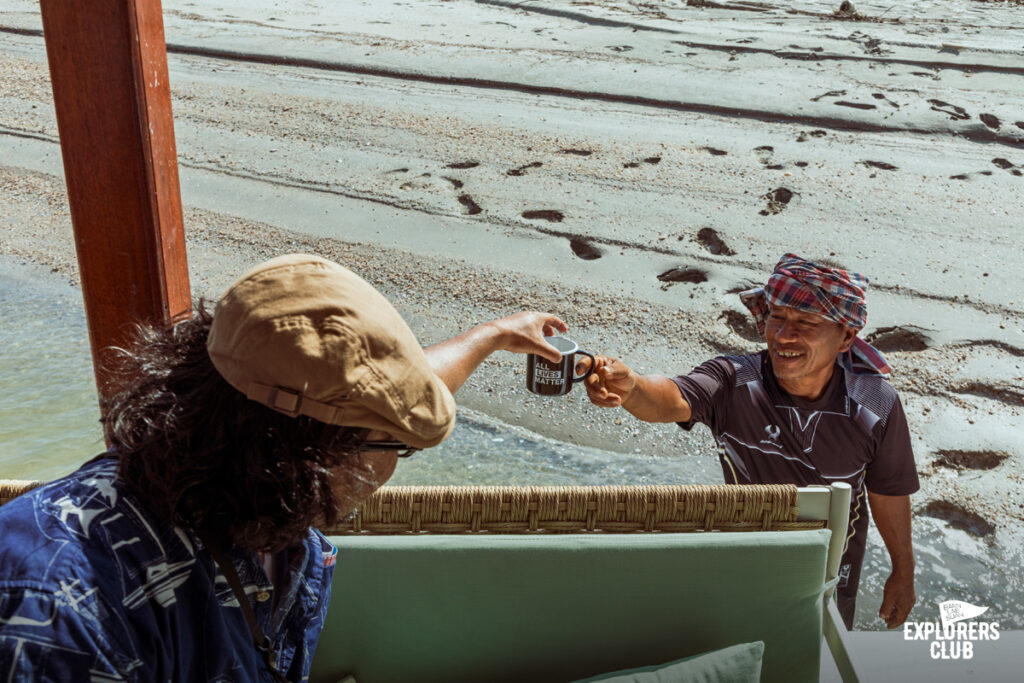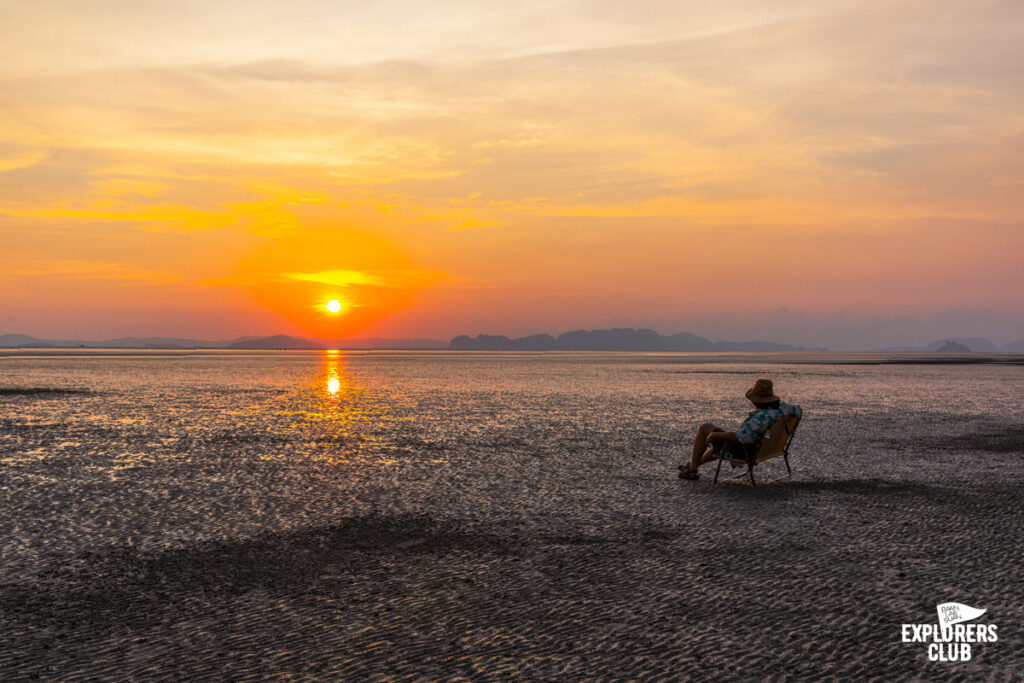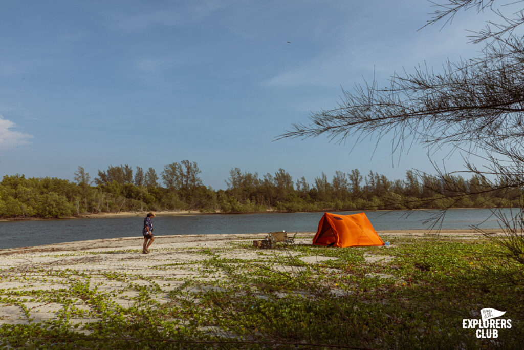 ก่อนจะยกข้าวของลงจากเรือผมเล็งมุมอยู่พักใหญ่กับการดูว่าเราจะสามารถแคมป์ตรงนี้ได้จริงหรือไม่ แน่นอนว่าการแคมป์ริมหาดสิ่งที่เราต้องคำนึงถึงเป็นอันดับแรกก็คือระดับน้ำทะเลมันจะขึ้นถึงไหนอันนี้ต้องเช็คให้แน่ใจก่อน หลังจากนั้นก็ต้องดูเรื่องกระแสลม ชายหาดไม่เหมือนในป่าที่มีต้นไม้คอยบังลม ตรงนี้โล่งกว่ามาก และมีกระแสลมแรงต่อเนื่องเต็นท์อาจมีสิทธิ์ลอยเป็นว่าวได้เลยถ้าไม่ได้ใช้สมอทรายด้ามยาวคอยยึดไว้ทุกมุม ต้องทุกมุมนะครับอย่าชะล่าใจบางมุมผมก็ใช้ถึง 2 ชิ้นเลยทีเดียวเพื่อความมั่นใจ อย่าเห็นว่าลมไม่แรงเลยปล่อยผ่านสบาย ๆ ให้เตรียมรับมือไว้ก่อนดีกว่า