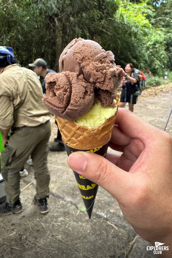 เดินลงเขามาสักพักใหญ่ จู่ ๆ มีเซอร์ไพรซ์จากทีมงาน “ไอติมมมมมมมมมมมมม……………..” เสียงพูดลากยาวที่เปล่งออกมาแบบอัตโนมัติ มันไม่ต่างจากโอเอซิสกลางทะเลทราย ผมรีบจัดโคนช็อคโกแลตช็อคชิพไปหนึ่งแท่ง รอบนี้ขอพักกันยาวหน่อย นั่งแผ่กันบนถนนโดยที่ไม่มีรถผ่านมาสักคัน ก่อนที่จะเดินตามถนนลาดยางลงไปด้านล่าง ขาที่ล้าและเท้าที่เจ็บ เดินขโยกตามเพื่อนไปห่าง ๆ