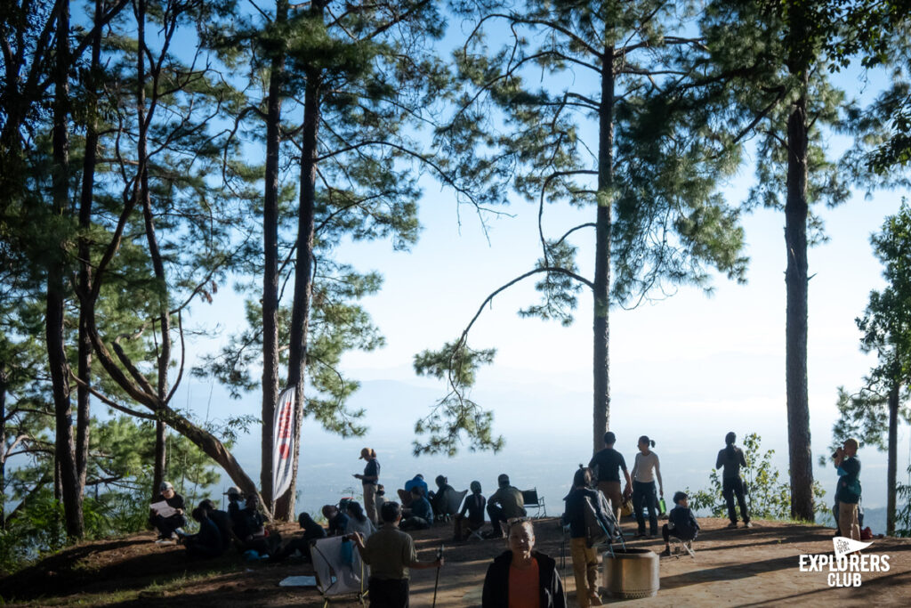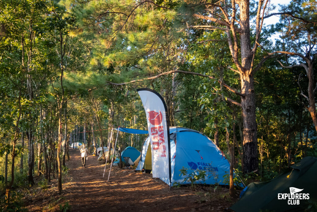 “อรุณสวัสดิ์” วันนี้เราตื่นกันแต่เช้า เสียงรูดซิปจากเต็นท์ข้าง ๆ เสียงคนพูดคุยเดินผ่านไปมา ทำให้รู้ว่าควรตื่นได้แล้ว เมื่อคืนอากาศเย็นสบาย นอนเปิดเต็นท์ก็ไม่หนาวเท่าไหร่ แต่ติดอย่างเดียวที่พื้นเอียง พอพลิกตัวก็ไหลไปกองขอบเต็นท์ นอนพลิกไปพลิกมาทั้งคืน หลับ ๆ ตื่น ๆ เหมือนนอนไม่ค่อยพอ แต่ก็พร้อมไปได้ ทำธุรส่วนตัวเก็บข้าวของลงเป้ และออกไปทานข้าวเช้ากันที่ลานแคมป์ไฟ ทานมื้อเช้าพร้อมรับมือเที่ยงกันเสร็จก็พร้อมที่จะเดินลง เรากลับมาที่จุดกางเต็นท์ของเรา เอาเป้ขึ้นหลัง รับบรีฟจากทีมสต๊าฟ