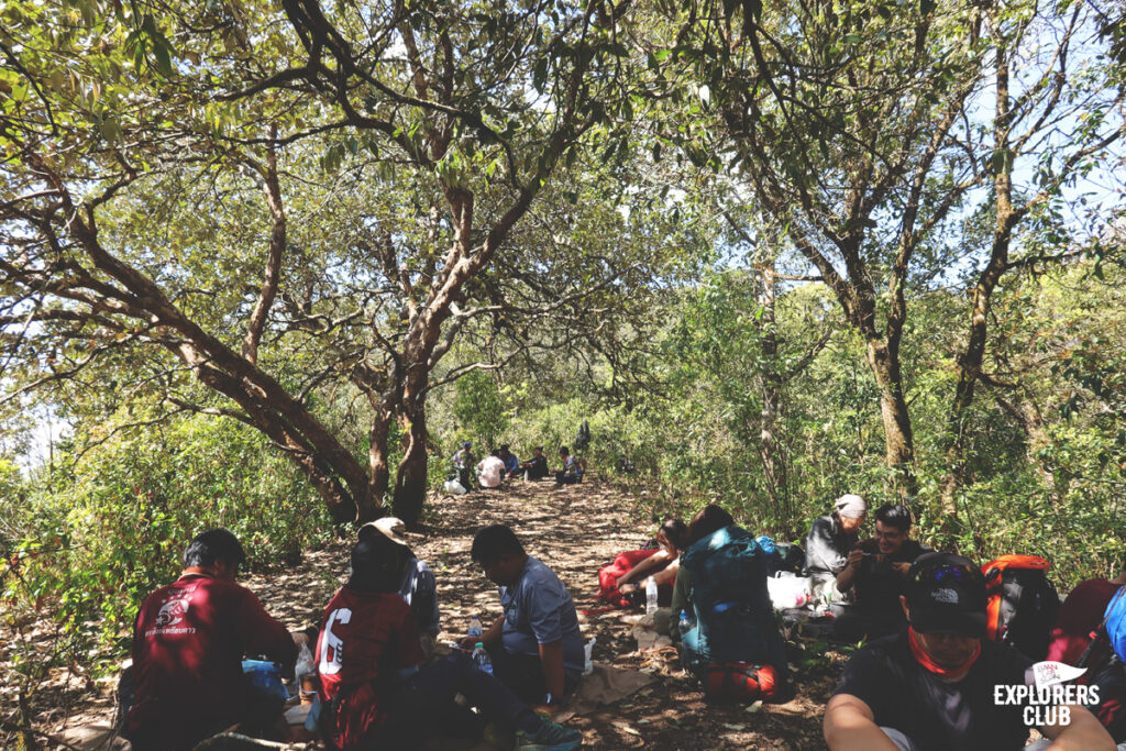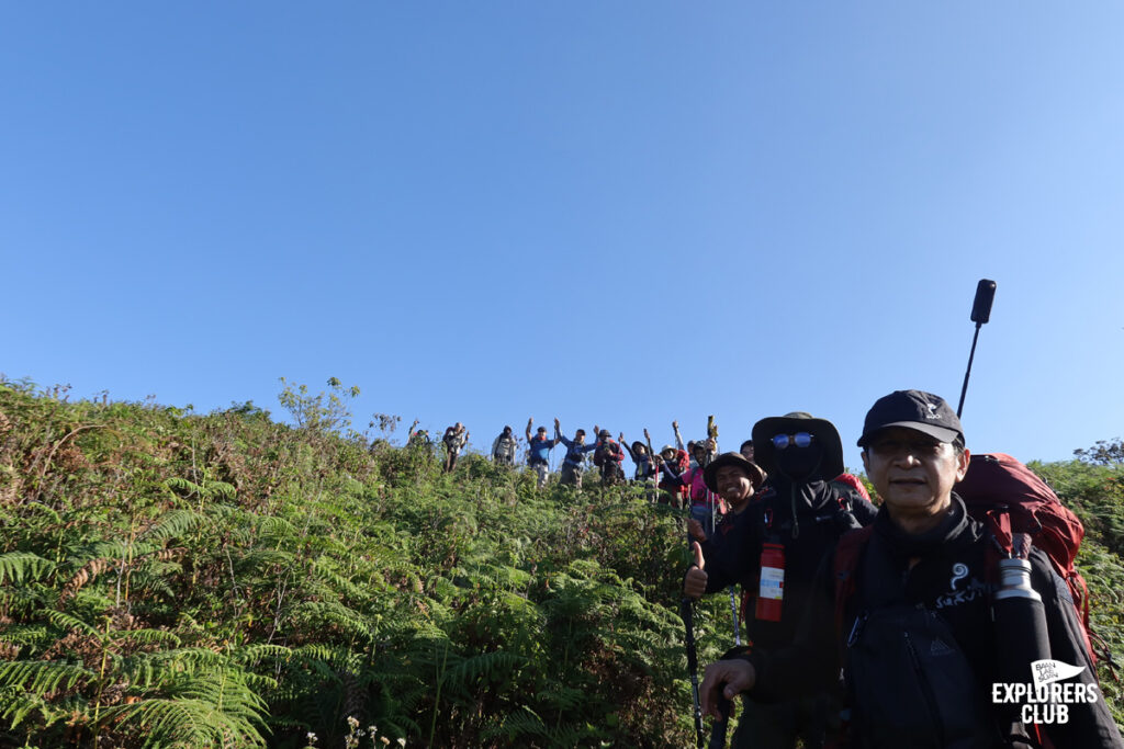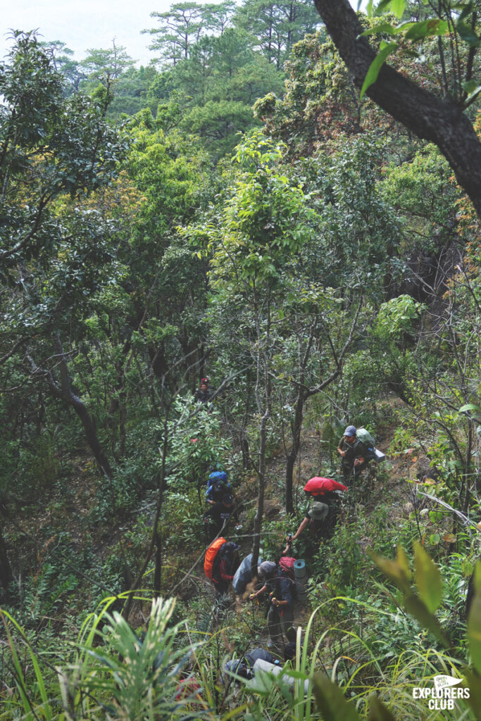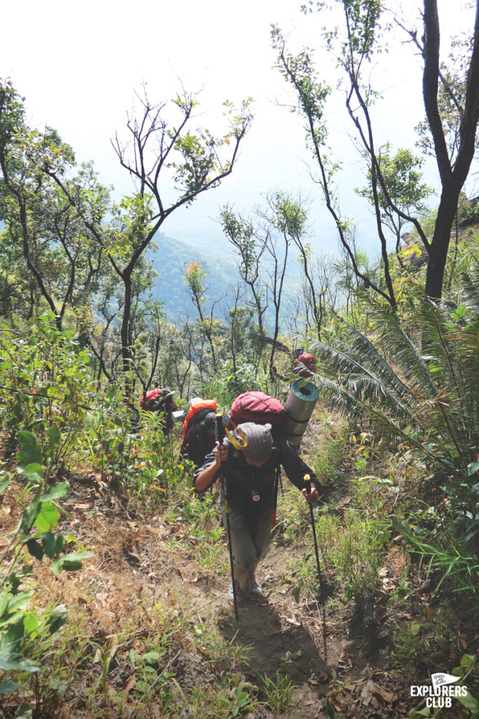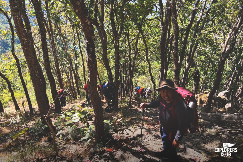 เราเดินกันบนทางราบได้ไม่นานหลังจากนั้นร่างกายของพวกเราก็ไม่ได้อยู่ในตำแหน่งที่ทำมุมองศาปกติอีกเลย ตัวโน้มเอียงไปด้านหน้า เสียงพูดคุยถูกแทนที่ด้วยเสียงลมหายใจฟื้ดฟ้าด ถึงผมไม่ได้มีนาฬิกาสมาร์ทวอทช์แต่ก็รับรู้ถึงการเต้นของหัวใจที่เพิ่มเร็วขึ้น การเดินขึ้นทางชันต้องอาศัยการเดินอย่างช้า ๆ และก้าวสั้น ๆ ไปตามจังหวะที่สบายที่สุดของเราเอง ไม่จำเป็นต้องไล่หวดให้ทันคนข้างหน้า การเดินป่าแบบนี้มันไม่ใช่การแข่งขัน ไม่ต้องพิสูจน์ให้ใครเห็นว่าเราแข็งแกร่งอะไร แต่มันเป็นการเดินเพื่อการทำความเข้าใจร่างกายของตนเอง เหนื่อยก็พัก เป้หนักก็ปลดวาง เดินเร็วก็หยุดรอ หายเหนื่อยแล้วไปต่อก็แค่นั้น ตอนนี้ไข่ต้มสองฟอง ข้าวต้มสามถ้วยจากมื้อเช้าที่ผมซัดมาเต็มที่ได้ใช้อย่างคุ้มค่าแล้ว