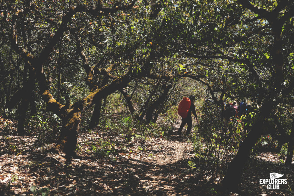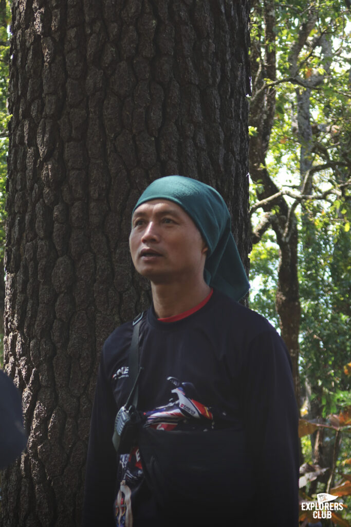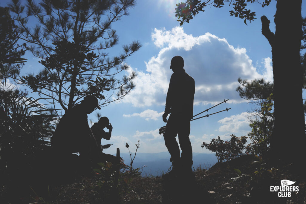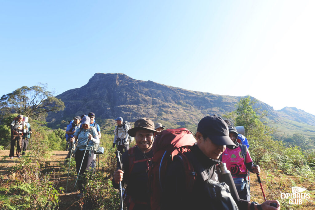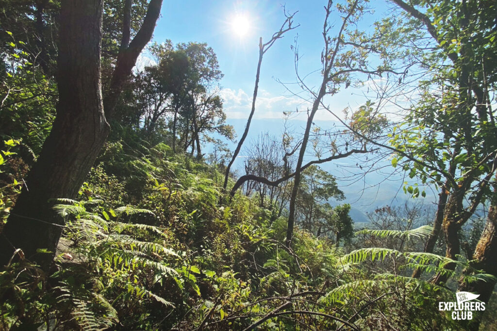 เราเดินกันบนทางราบได้ไม่นานหลังจากนั้นร่างกายของพวกเราก็ไม่ได้อยู่ในตำแหน่งที่ทำมุมองศาปกติอีกเลย ตัวโน้มเอียงไปด้านหน้า เสียงพูดคุยถูกแทนที่ด้วยเสียงลมหายใจฟื้ดฟ้าด ถึงผมไม่ได้มีนาฬิกาสมาร์ทวอทช์แต่ก็รับรู้ถึงการเต้นของหัวใจที่เพิ่มเร็วขึ้น การเดินขึ้นทางชันต้องอาศัยการเดินอย่างช้า ๆ และก้าวสั้น ๆ ไปตามจังหวะที่สบายที่สุดของเราเอง ไม่จำเป็นต้องไล่หวดให้ทันคนข้างหน้า การเดินป่าแบบนี้มันไม่ใช่การแข่งขัน ไม่ต้องพิสูจน์ให้ใครเห็นว่าเราแข็งแกร่งอะไร แต่มันเป็นการเดินเพื่อการทำความเข้าใจร่างกายของตนเอง เหนื่อยก็พัก เป้หนักก็ปลดวาง เดินเร็วก็หยุดรอ หายเหนื่อยแล้วไปต่อก็แค่นั้น ตอนนี้ไข่ต้มสองฟอง ข้าวต้มสามถ้วยจากมื้อเช้าที่ผมซัดมาเต็มที่ได้ใช้อย่างคุ้มค่าแล้ว
