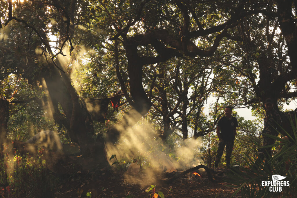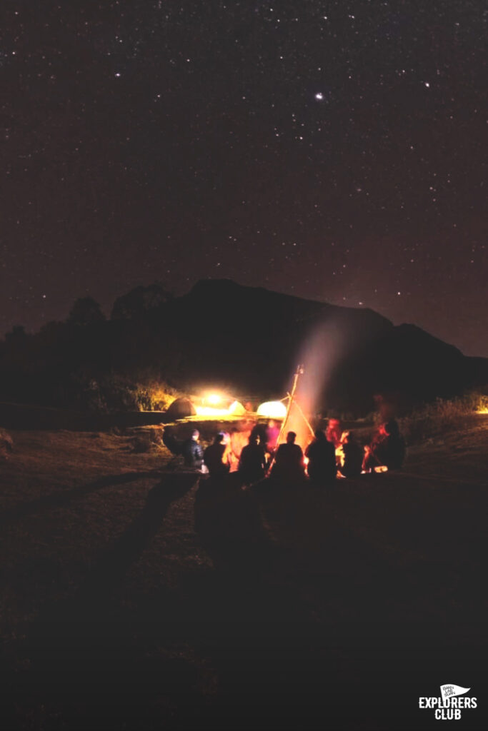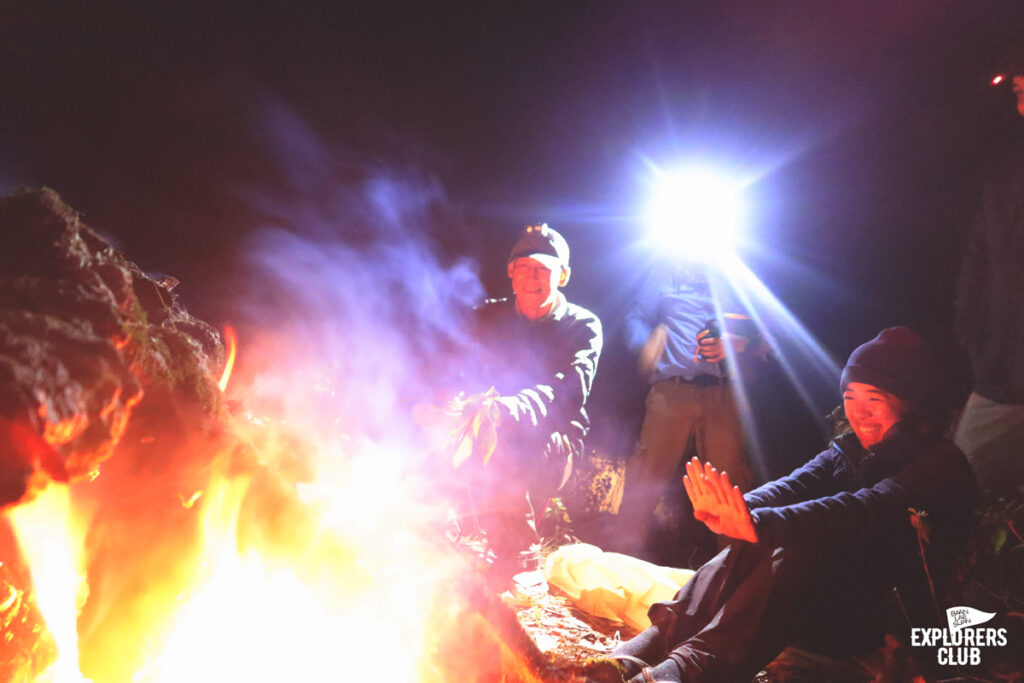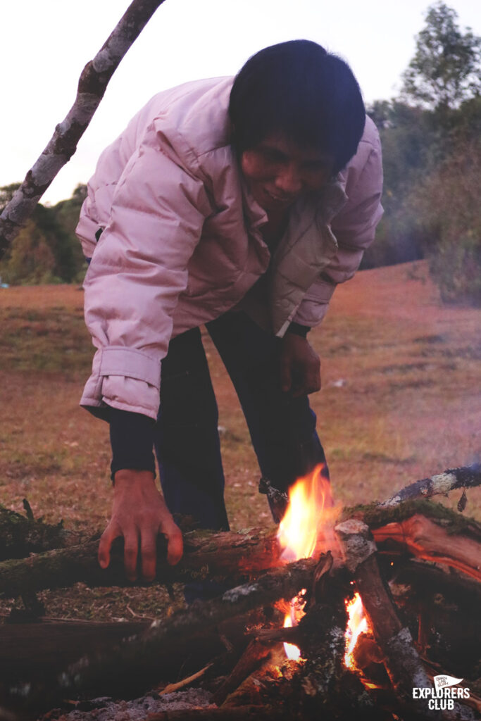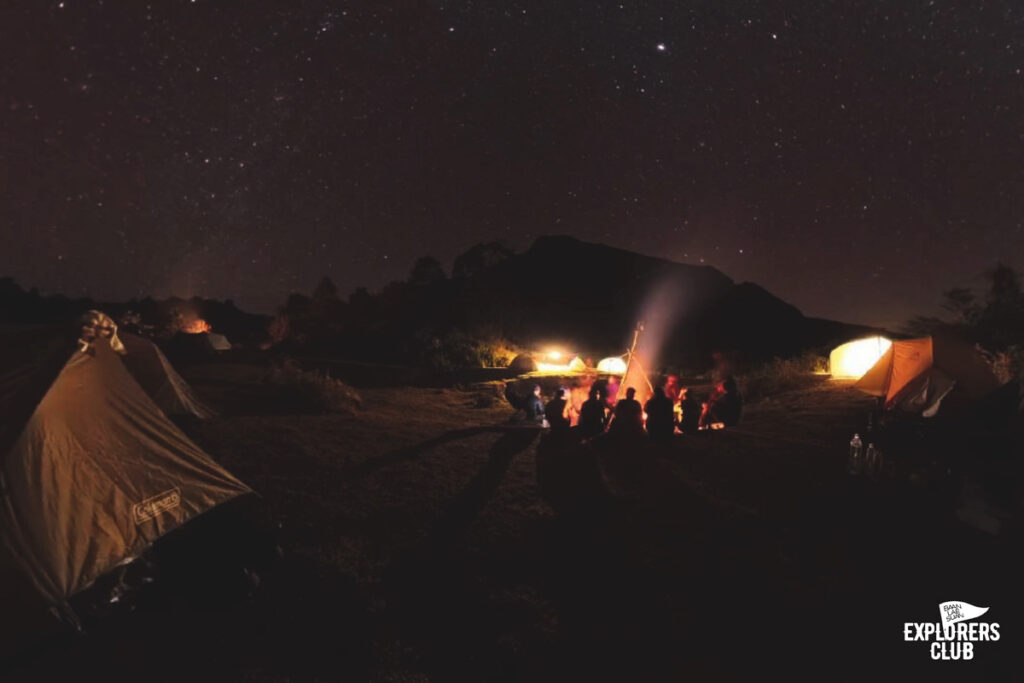 เราเตรียมอาหารเย็นกันอย่างง่าย ๆ แล้วไปรวมตัวกันที่รอบกองไฟพูดคุยกันสักพัก ก่อนที่จะแยกย้าย หลายคนไม่ลุกไปไหนเพราะยังตัดใจจากกองไฟอุ่น ๆ นี้ไม่ได้ “ใครจะไปดูดาวบ้าง” ประโยคคำถามดังขึ้นอีกครั้ง แต่ความกระตือรือล้นไม่เหมือนช่วงเย็นอาจเพราะอาการเพลียของวันนี้ผสมกับฤทธิ์เดชของมื้อเย็น และอากาศหนาวทำให้การนั่งชมดาวริมหน้าผาเย็น ๆ เทียบไม่ได้กับการขดตัวอยู่ใต้ถุงนอนอุ่น ๆ ผมคือหนึ่งในคนที่บอกลากับหมู่ดาวแล้วขอเลือกอยู่ในเต็นท์แทน คืนนี้เอาไว้ก่อน ถ้าพรุ่งนี้ฟ้ายังเป็นคืนเดือนมืดก็ค่อยว่ากันใหม่…
