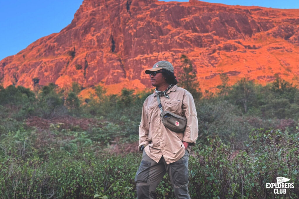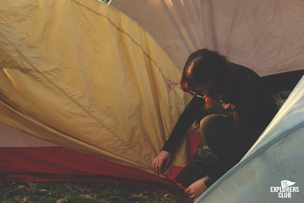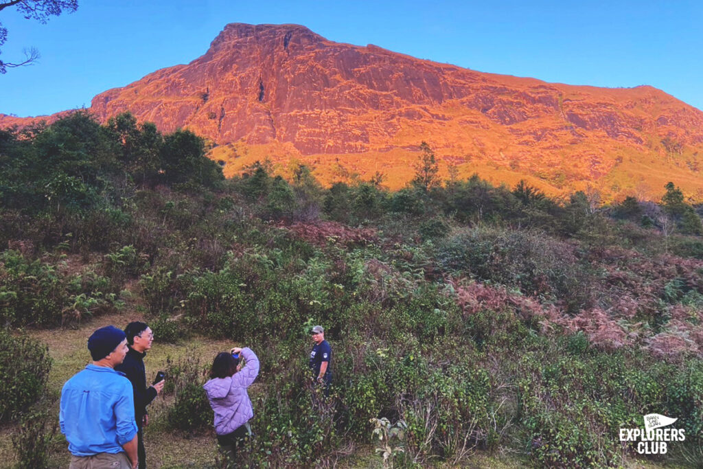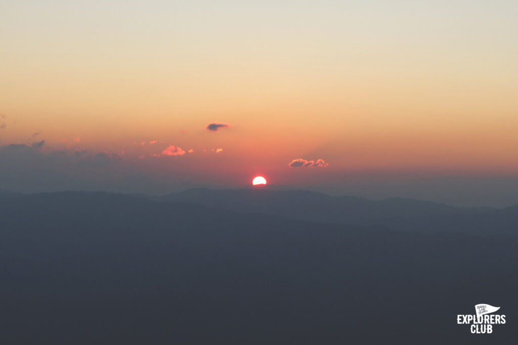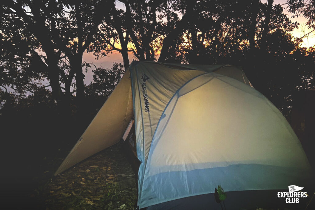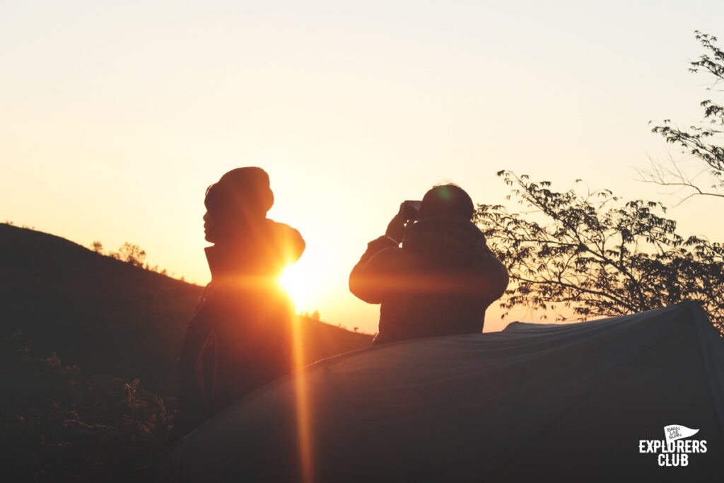 เรามาถึงจุดพักแรมกันเกือบห้าโมงเย็นเลยจากเวลาประเมินไปหน่อย พวกเรามาทันดูพระอาทิตย์ตกดินตอนนี้เหมือนทุกคนลืมไปแล้วว่าก่อนหน้านี้เหนื่อยกันมาขนาดไหน สีหน้าเปื้อนยิ้มมาแทนที่หน้าตาเหยเกเมื่อบ่ายที่ผ่านมา ความเข็ดขยาดทางชันเมื่อไม่กี่นาทีที่แล้วกลายเป็นเรื่องเล่าที่ตลกขบขัน แดดสีทองฉาบทั้งคน และธรรมชาติให้กลายเป็นโทนเดียวกัน ไม่มีใครปฏิเสธความงามตรงหน้าได้ลงคอ เสียงพูดคุยระงมค่อย ๆ ลดระดับเบาลงตามจังหวะอาทิตย์คล้อยลงลับเหลี่ยมเขา เราทั้งหลายต่างจดจ่อกับช่วงเวลาที่สัมผัสได้กับตาว่าโลกหมุนเร็วแค่ไหน