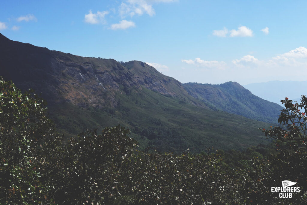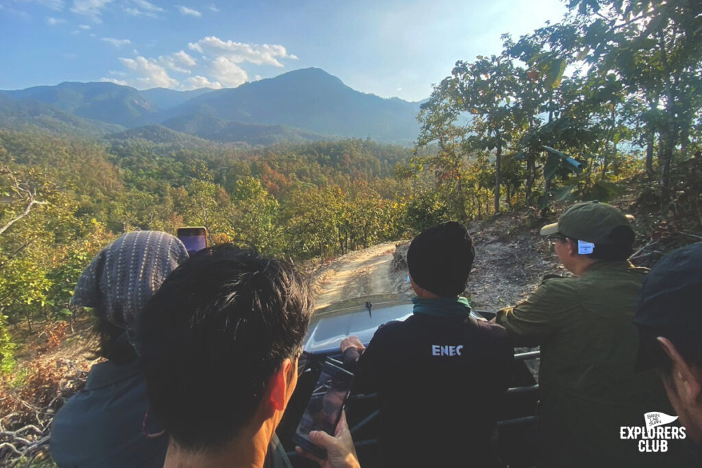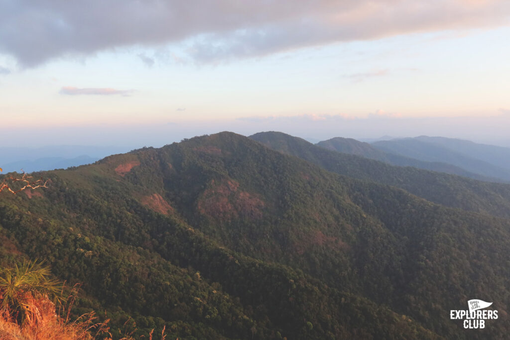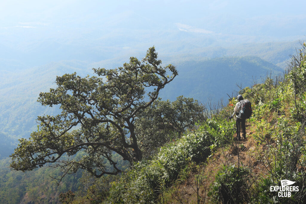 ในระดับความสูงที่เพิ่มขึ้นมักมาพร้อมวิวของทิวเขาสลับซับซ้อนตระการตาพ่วงมาด้วย บางจุดเราต้องเดินบนทางแคบเลาะหน้าผา สำหรับคนที่รังเกียจความสูงเส้นทางบริเวณนี้ค่อนข้างเร้าใจไม่น้อย มันทำให้เราเห็นทัศนียภาพได้ชัดเจนแบบไม่มีอะไรมาบดบัง ป่าผืนใหญ่ต้นไม้เขียวหนาไม่ค่อยพบเห็นไร่หรือพื้นที่เกษตรกรรมขนาดใหญ่เท่าไหร่ ชาวเขาแบ่งพื้นที่ป่าไว้อย่างดีส่วนหนึ่งเป็นพื้นที่อนุรักษ์ บางส่วนเป็นพื้นที่ให้ชาวบ้านดำรงชีพ ผมเลยนึกย้อนไปถึงสิ่งพ่อหลวงบอกไว้ก่อนที่เราจะเดินขึ้นมากันว่าแถวนี้ชาวบ้านเขาปลูกข้าวทำไร่ไว้กินเองเป็นหลักเหลือก็ขายบ้างนิดหน่อย ไม่มีไร่ข้าวโพด ไม่ได้ใช้เคมีทำไร่เลยทำให้ป่าแถวนี้มีสัตว์ชุกชุม เสียงนกระงมที่ผมได้ยินตลอดเส้นทางก็พอจะเป็นพยานถึงสิ่งที่พ่อหลวงพูดไว้ได้ดี