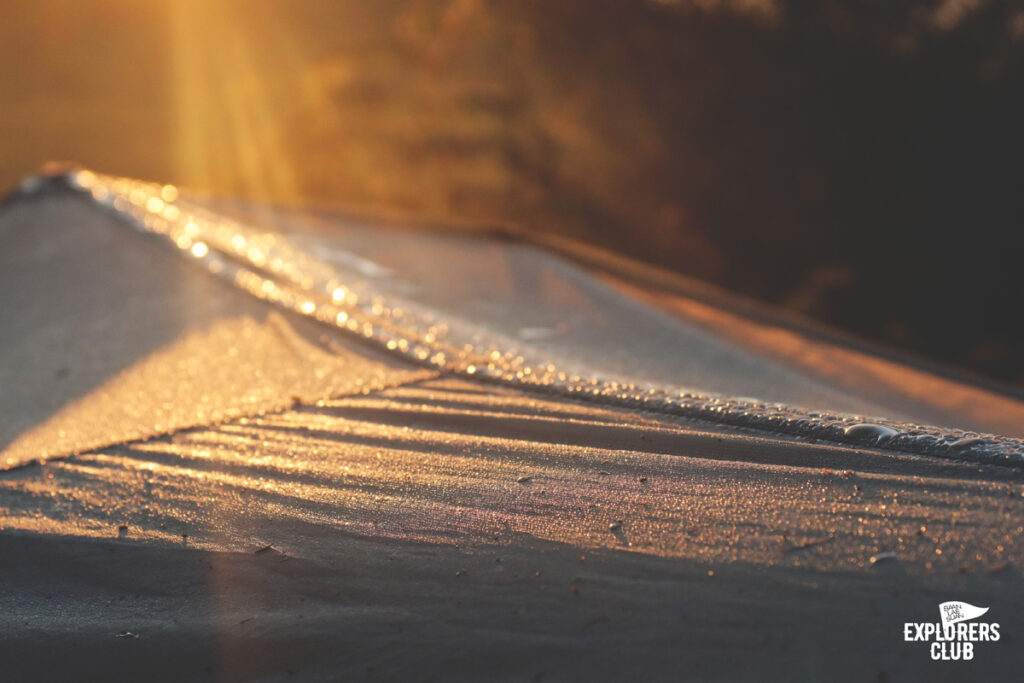 วันนี้เราพักในป่าถึงไม่มีลมแรงปะทะ แต่หลังจากได้สัมผัสกับอากาศแถวนี้เมื่อช่วงเย็นก็พอเห็นอนาคตได้ทันทีว่าคืนนี้น่าจะเอาเรื่อง แต่ผมเตรียมตัวรับมือกับความหนาวมาอย่างดีเลยไม่มีอะไรต้องกังวล ช่องว่างด้านล่างของทาร์ปถูกดึงลงต่ำเรี่ยพื้นเพื่อป้องกันลม และอากาศเย็นจากภายนอก ในฤดูหนาวแบบนี้ต้องเตรียมอุปกรณ์ และเสื้อผ้าที่ให้ความอบอุ่นมาให้พร้อม เลือกถุงนอนที่ป้องกันอุณหภูมิต่ำได้ และควรมีขนาดพอดีตัวไม่ต้องใหญ่เพราะเราไม่ต้องการให้ภายในมีช่องว่างเยอะเพื่อการกักเก็บอุณภูมิที่ดี เสื้อผ้าเป็นไปได้ก็ต้องเลือกแบบที่ให้ความอบอุ่น และถ้ามันมีน้ำหนักเบาด้วยจะดีมาก