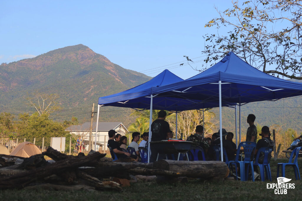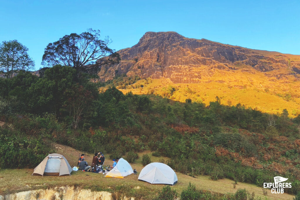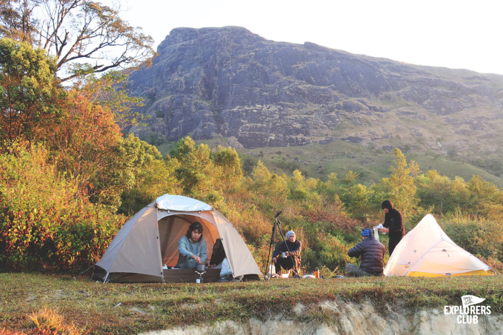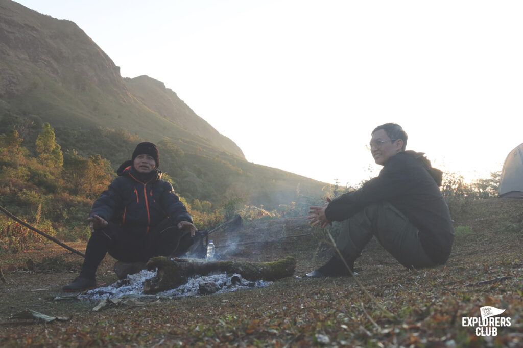 วันนี้เราเดินกันถึงจุดพักแรมกันแบบเหงื่อยังไม่ทันชุ่มหลังดี จุดกางเต็นท์ของเราวันนี้อยู่ในหุบโล่ง หากเป็นฤดูช้างป่าแถวนี้ก็เป็นเหมือนบ้านของพวกมัน พี่บอยคนนำทางว่าแบบนั้น เราไม่ต้องนอนเอียง ๆ กันเหมือนเมื่อคืนแล้วแถวนี้เรียบ โล่ง กางเต็นท์ได้หลายหลังแบบไม่เบียดกัน ใ ผมจัดแจงหาที่กางเต็นท์ แล้วหันทางเข้ารับวิวภูเขาตระหง่านตรงหน้าแบบไม่สนทิศทางลมว่ามันจะพัดมาทางไหน “ช่างมันหันหาวิวสวยดีกว่า” ผมพึมกับตัวเองอยู่ครู่หนึ่งหลังจากจับเต็นท์หมุนไปหมุนมาวันนี้ผมขอนอนมองวิวสวย ๆ แบบนี้จนหลับ แล้วตื่นมาเห็นมันอย่างมีความสุขดีกว่า