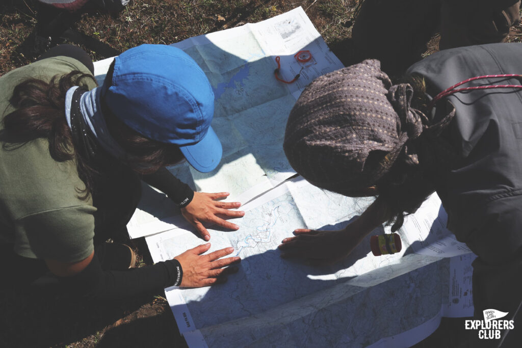 สำหรับพวกเราวันที่สองมีบทเรียนจากคณะโรงเรียนนักเดินป่าจะต้องสอนกันเล็กน้อยกับวิชาแผนที่ และเข็มทิศ และการปฐมพยาบาลเบื้องต้น หลังจากทุกคนพร้อมสะบัดเป้ขึ้นหลังเราก็มุ่งหน้าเดินทางต่อ เราเดินกันมาถึงสันเขาโล่ง และมีที่ราบพอที่จะเห็นวิวในมุมกว้าง ทิวเขาซับซ้อนเบื้องหน้าทำหน้าที่เหมือนสื่อการสอนให้นักเรียนเดินป่าทุกคนเข้าใจเรื่องแผนที่ได้อย่างไม่ยาก