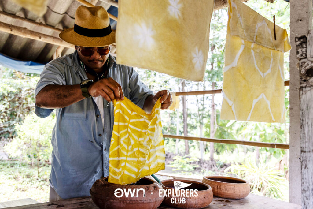 ย้อมกับเครื่องสมุนไพรหลายอย่างที่ต้องลงมือโขลกเองในครกไม้จากนั้นก็นำไปผสมน้ำ แล้วเอาผ้าขาวไปจุ่มแช่ แกะและตากเพียงเท่านี้คุณก็ได้ผ้าเช็ดหน้าลวดลายชิ้นเดียวในโลกสุดออร์แกนิกมาใช้แล้ว