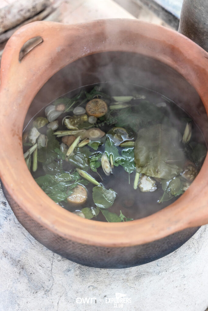 พวกเราเลือกการแช่เท้าด้วยเกลือผสมสมุนไพรสูตรของที่นี่ แม่ ๆ ป้า ๆ บอกว่าใครที่มีปัญหาเรื่องกลิ่นเท้าอันนี้ได้ผลเลย ต่อมาเป็นการ “โฮมยา” หรือการอบสมุนไพรด้วยการหายใจสูดกลิ่นเข้าไปเพื่อช่วยให้ระบบทางเดินหายใจทำงานได้ดี เป็นหวัดคัดจมูกเจอสูตรนี้เข้าไปก็ช่วยได้