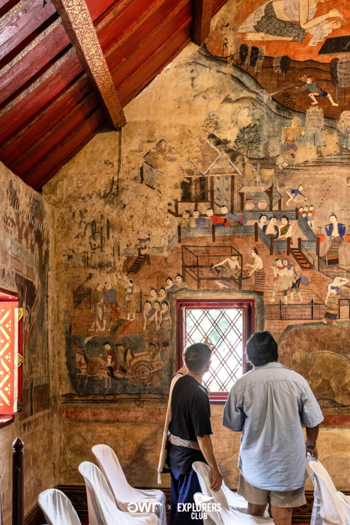 การเดินชมงานจิตรกรรมฝาผนังด้านในยิ่งมีไกด์ท้องถิ่นอย่างหนานโชติพาทัวร์ด้วยแล้วทำให้การเที่ยวชมที่นี่ได้ทั้งความรู้ความ และความสนุกผสมกันไป ยิ่งเพิ่งได้เรียนอ่านตั๋วเมืองมายิ่งสนุก ถามว่าอ่านออกรึเปล่า ก็ต้องบอกว่าไม่ แค่ชั่วเวลานั่งรถจากบ้านหนานโชติมาถึงวัดก็ลืมหมดแล้ว ไอ้ที่จะจำได้ก็เพียงบางตัวเท่านั้นแต่ก็ทำให้เราสนุกและตั้งใจดูรายละเอียดของภาพเขียนเหล่านั้นมากขึ้นงานภาพเขียนส่วนใหญ่จะเป็นเรื่องราวของนิทานชาดก และวิถีชีวิตของชาวน่านในอดีต