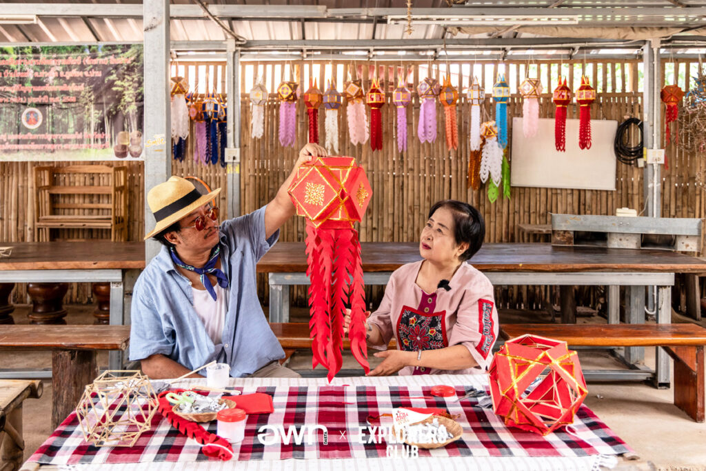 ไหน ๆ ก็ไปเรียนเขียนตั๋วเมืองแล้วพวกเราก็ขอเลือกไปทำโคมไฟแบบล้านนากันต่อเสียเลยเรากระเถิบออกมาจากวัดภูมินทร์ไม่ไกลนักทันทีที่รถถึงจุดหมาย แม่ถิรนันท์ โดยดี ผู้ก่อตั้ง บ้านโคมคำ ส่วนหนึ่งของ “วิสาหกิจชุมชนบ้านโคมคำ ม่วงตึ๊ด” ก็ออกมาต้อนรับพวกเราอย่างอารมณ์ดี เตรียมที่เตรียมอุปกรณ์ พร้อมของว่างไว้เรียบร้อย